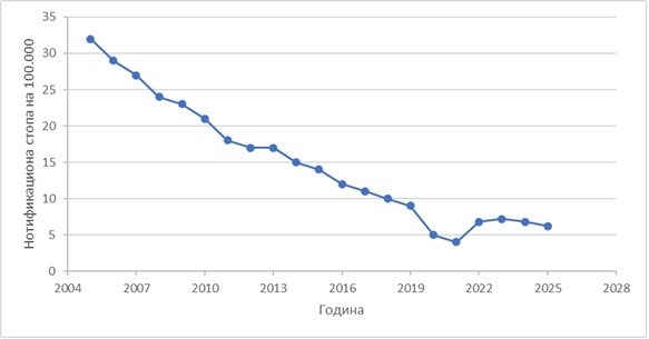 Grаfiкоn 1. Кrеtаnjе nоtifiкаciоnе stоpе TB u pеriоdu оd 2005. dо 2025. gоdinе u Rеpublici Srbiјi